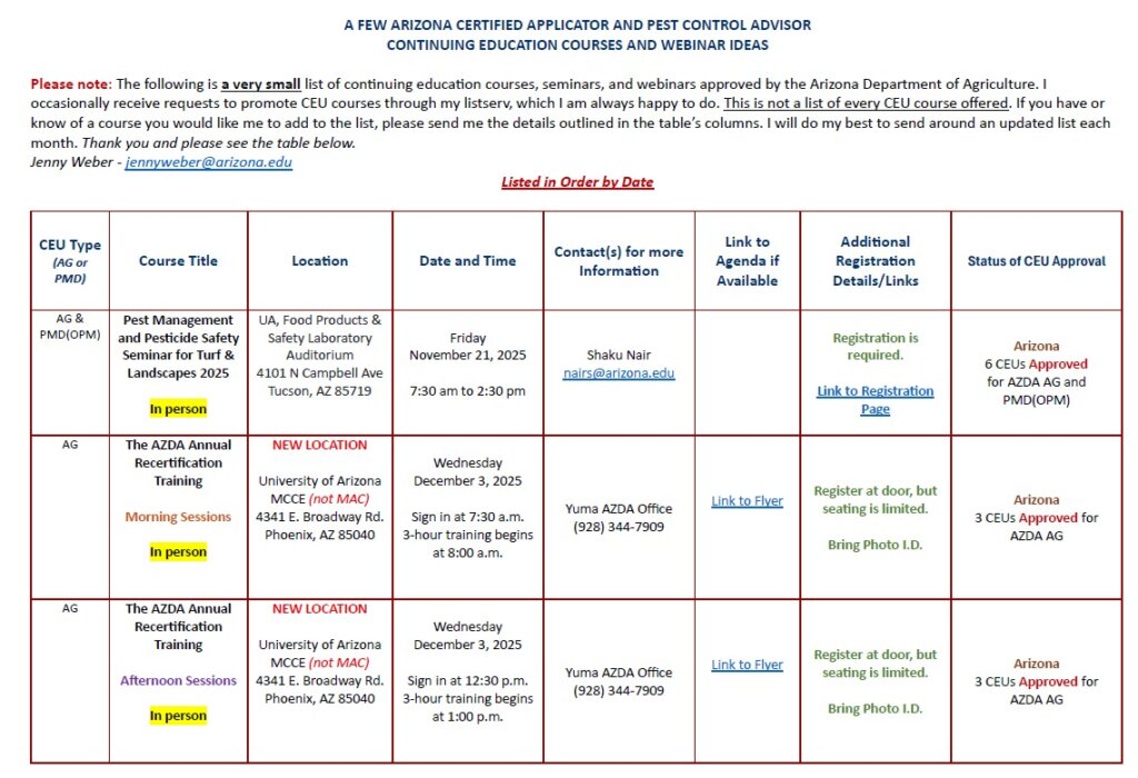 Thank you to Jennifer Weber, UofA Maricopa County Cooperative Extension- Pesticide Safety Education Program for making this list available Click here to see the full list of CEU Opportunities